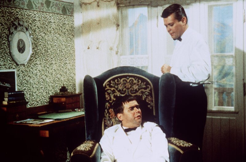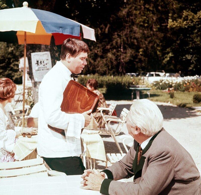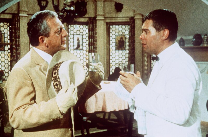 "Im singenden Rössel am Königssee", "Rössl"-Wirtin Cordula hat nur noch zwei Wochen Zeit, um einen Mann aus dem Hotelgewerbe zu heiraten. Die von ihrem Vater testamentarisch gesetzte Frist läuft ab. Der gesamte Betrieb würde sonst an ihren Onkel Simon gehen. Zwar hat es Cordula auf den feschen Kellner Franz (Peter Weck) abgesehen, doch dieser ist bereits Hals über Kopf in die Hotelfachschülerin Monika verliebt. Da bringt Zwillingsbruder Benedikt (ebenfalls Peter Weck) Verwirrung ins Spiel.Im Bild (v.li.): Gunther Philipp (Karlheinz Eberhard Strax), Peter Weck (Franz Fidelis / Benedikt Fidelis). SENDUNG: ORF3 - SA - 24.10.2020 - 13:15 UHR. - Veroeffentlichung fuer Pressezwecke honorarfrei ausschliesslich im Zusammenhang mit oben genannter Sendung oder Veranstaltung des ORF bei Urhebernennung.Bild: © ORF