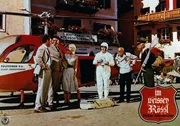 Der schrullige Unternehmer Sülzheimer (Gunther Philipp, 3.v.r.) demonstriert seine neueste Erfindung: einen fliegenden, ferngesteuerten Koffer. Es staunen amüsiert Dr. Siedler (Adrian Hoven, l.), Professor Hinzelmann (Werner Finck, 2.v.l.), seine Tochter Klärchen (Estella Blain, 3.v.l.), Piccolo Franzl (Frithjof Vierock, 2.v.r.) und der Portier (Fritz Heller, r.).