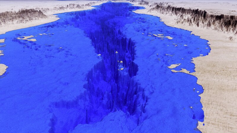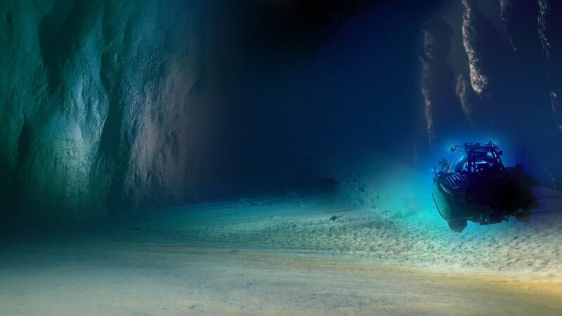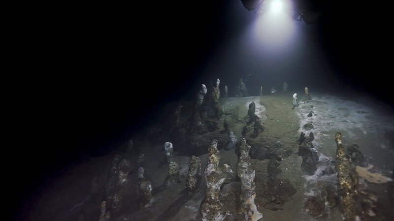 Mit zwei Tauchbooten stoßen sie bis in 1.000 Meter Tiefe vor. Sie entdecken bizarre Lebenswelten, die an Urweltszenarien aus den Anfangszeiten des Lebens erinnern. Mikroorganismen bilden meterhohe Türme, sogenannte Schlote. Bakterien weben dichte Matten, die anderen Lebewesen als Nahrung dienen. Ferngesteuerte Tauchroboter erkunden 1.600 Meter unter dem Meeresspiegel rätselhafte Strandlandschaften mit Brandungswellen, Uferzonen und Dünen ähnelnden Regionen. Hoch konzentrierte Salzlösung, die sich nicht mit dem normalen Meerwasser vermischt, bildet am Grund isolierte Seen, in denen wegen des fehlenden Sauerstoffs kein höheres Leben möglich ist. Diese Sole ist so dicht, dass selbst Tauchfahrzeuge nicht in sie eindringen können. Ein Spezialgerät nimmt einige Proben. Es werden unzählige Bakterien gefunden, von denen 90 Prozent völlig unbekannt sind. Sie könnten im Untergrund seit Urzeiten überdauert haben und nun Hinweise auf die Entstehung des Lebens liefern.