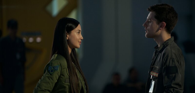 Die wunderschöne und intelligente Pilotin Rain Lao (Angela Yeung Wing, l.) verdreht Charlie Miller (Travis Tope, r.) sofort den Kopf, als sie auf der Mondbasis landet. Doch seine Schwärmereien werden durch einen Alien-Angriff jäh unterbrochen ...Bild: © 2016 Twentieth Century Fox Film Corporation. All rights reserved. Lizenzbild frei