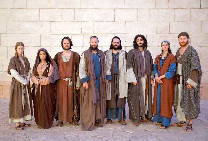 Jesus (Eidin Jalali) verlebt die letzten Tage seines Lebens inmitten seiner Gefolgsleute in Jerusalem. Gruppenbild u.a. mit Miriam von Bethanien (Valerie Sophie Körfer, l.), Petrus (Isaak Dentler, 4.v.l.), Jesus (Eidin Jalali, 3.v.r.), Maria von Magdala (Laura Berlin, 2.v.r.), Judas (Lucas Prisor, r.); weitere Personen (Statisten)