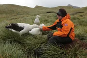 Ornithologin Jessica Walkup mit Wanderalbatrossen. Sie verbringt 18 Monate auf dem abgelegenen Eiland.Bild: © BR/Roland Gockel