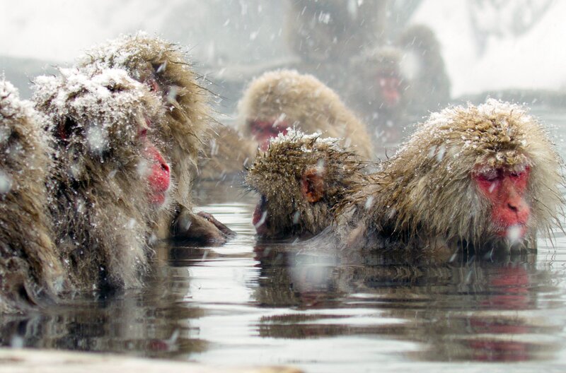 Die Affen nutzen die heißen Quellen, um sich aufzuwärmen.Bild: © NHK