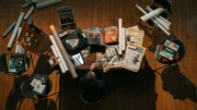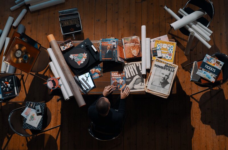 Der Schreibtisch von Hugues Ozouf mit Zeitschriften und historischen Postern zu Jimmy Somerville. Der Historiker und Sammler erforscht die musikalische Laufbahn Somervilles.Bild: © Pop Films/13 Prods