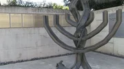 Eine Menora aus Eisenbahngleisen in Erinnerung an die Deportationszüge, im Hintergrund Tafeln zu Ehren von Judenrettern in der Schweiz.Bild: © 3sat