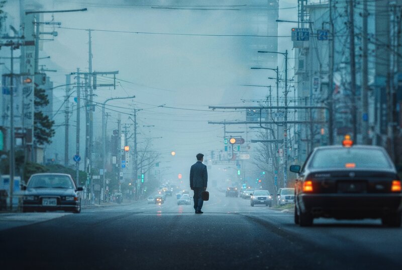 Ein Mann mit einem kleinen Koffer läuft verloren und isoliert mitten auf der Fahrbahn einer Straße in einer japanischen Großstadt. Weiteres Bildmaterial finden Sie unter www.br-foto.de.Bild: © BR/Ossa Film/Abel van Erkel