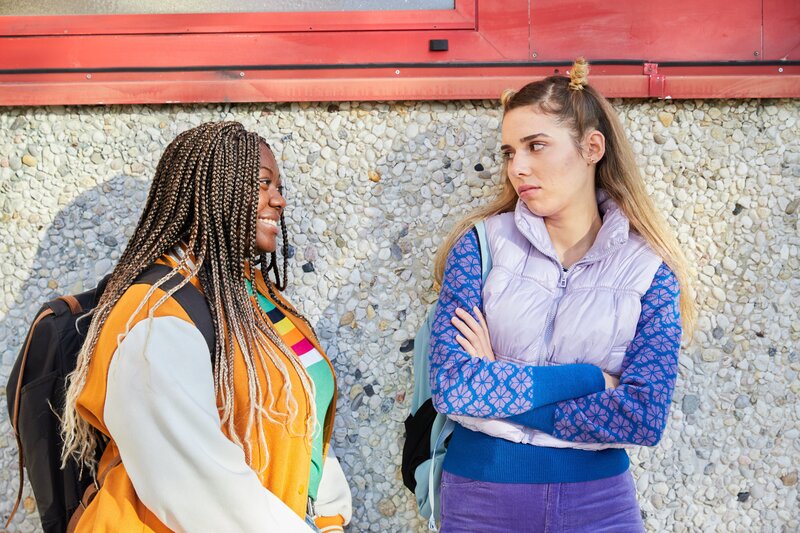 Juli (Jedidah-Isabel Annor, l.) und ihre beste Freundin Mara (Emilia Eidt, r.) sind unzertrennlich. Mara (Emilia Eidt, r.) ist unzufrieden mit ihrer Nase.