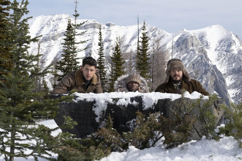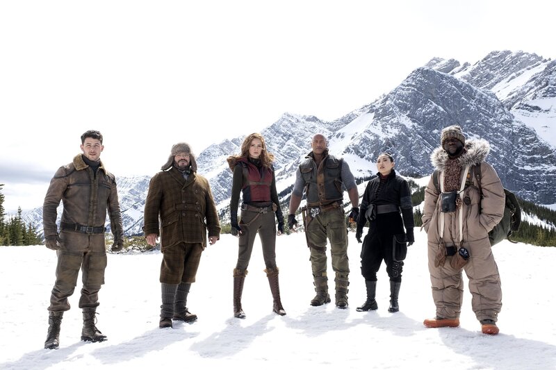 Oberon (Jack Black, l.), Ruby (Karen Gillan, 2.v.l.), Ming (Awkwafina, M.) und Bravestone (Dwayne Johnson, r.) müssen sich in Jumanji-Land warm anziehen.Bild: © PLURIMEDIA (Sony Pictures Releasing France / Seven Bucks Productions / Hartbeat Productions / Matt Tolmach Productions / Sony Pictures Entertainment)