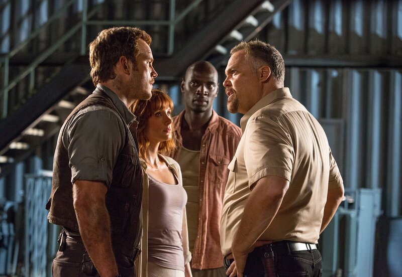 L-R: Owen Grady (Chris Pratt), Claire Dearing (Bryce Dallas Howard), Barry (Omar Sy), Vic Hoskins (Vincent D'Onofrio).Bild: © PLURIMEDIA (Universal Pictures / Amblin Entertainment / Legendary Pictures)