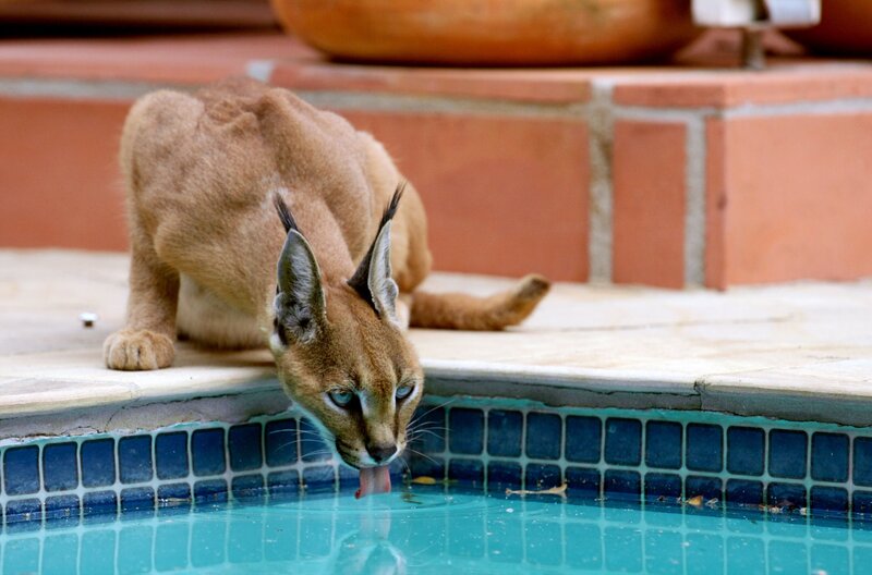 Die Karakal-Katzen dringen immer weiter in menschliche Ansiedlungen vor – so wie dieses Weibchen, das aus einem Swimmingpool trinkt.Bild: © ARTE / Saint Thomas Productions