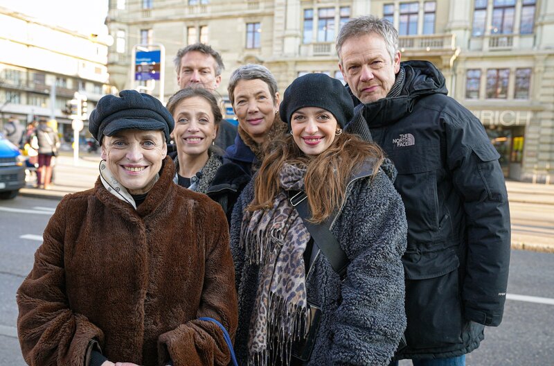 Wiedersehen der deutsch-französischen Theaterfamilie Thalbach-Besson an der Haltestelle Kunsthaus in Zürich: Katharina Thalbach, Anna Thalbach, Pierre Besson, Marie Besson, Nellie Thalbach und Philippe Besson (v.l.)