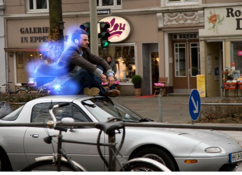 Als Geist kann Tom (Stephan Luca) auch mal eigenartige Fortbewegungsmittel nutzen. Um Jana nicht aus den Augen zu verlieren, setzt er sich einfach auf ihr Autodach ...Bild: © Dirk Dunkelberg