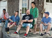 Die fünf Freunde Kurt (Chris Rock, l.), Eric (Kevin James, 2.v.l.), Rob (Rob Schneider, M.), Marcus (David Spade, 2.v.r.) und Lenny (Adam Sandler, r.) kommen albern vom Steg zurück. Plötzlich erblicken sie eine schöne Blondine, die am Haus angekommen ist.