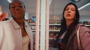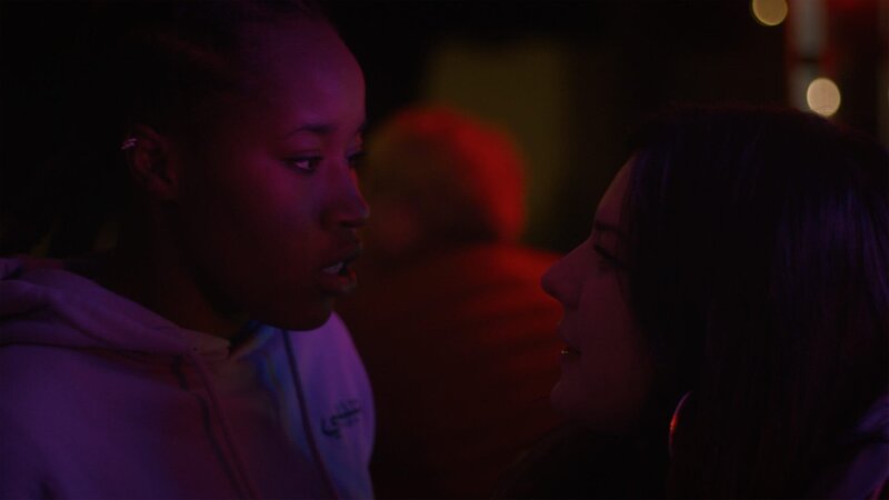 Von links: Carina (Marie Rosie Merz) streitet sich mit Denise (Lea Schmidt) vor dem Kiosk.Bild: © Petra Barkhausen / Hamburg Media School