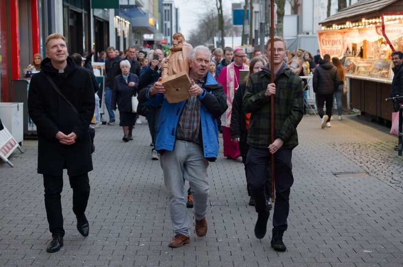 Die Gemeinde von St. Dionysius in Herne trägt Statuen ihrer geschlossenen Kirchen durch die Stadt – ein letzter gemeinsamer Gang in einer feierlichen Prozession, bevor die Türen für immer schließen.Bild: © ZDF und Marc Francke (ifage)