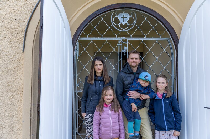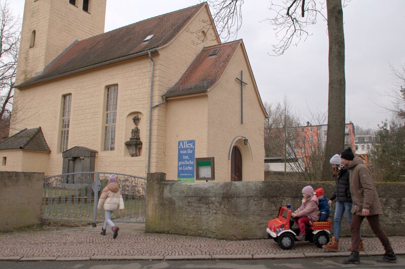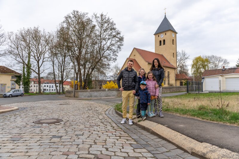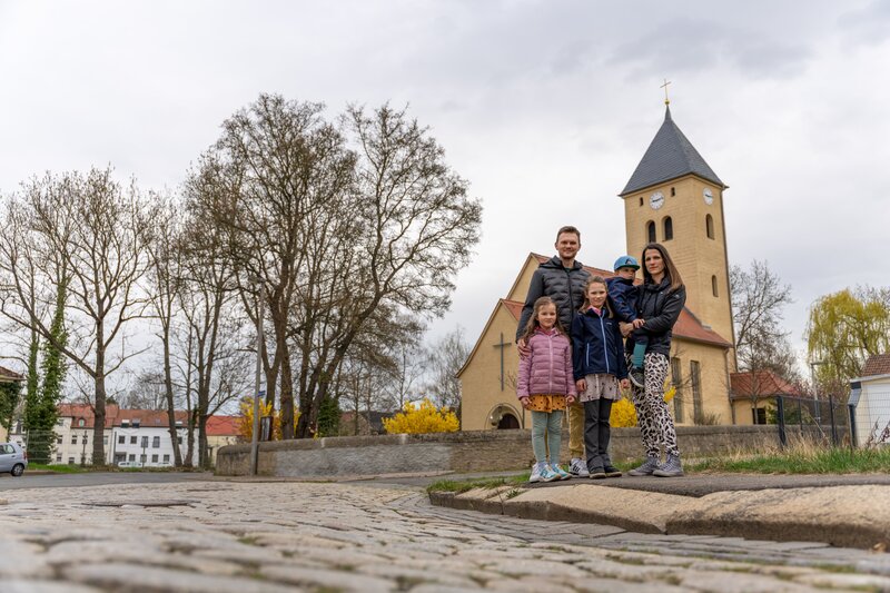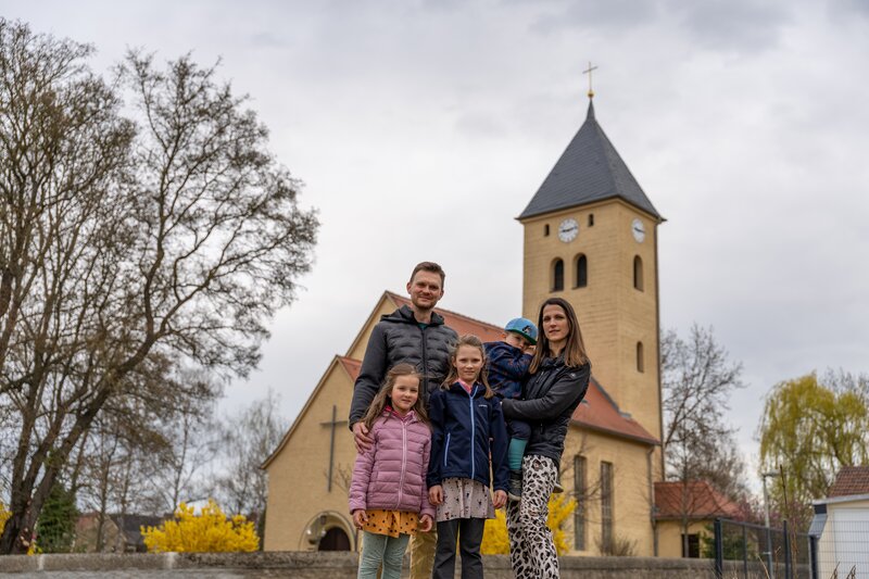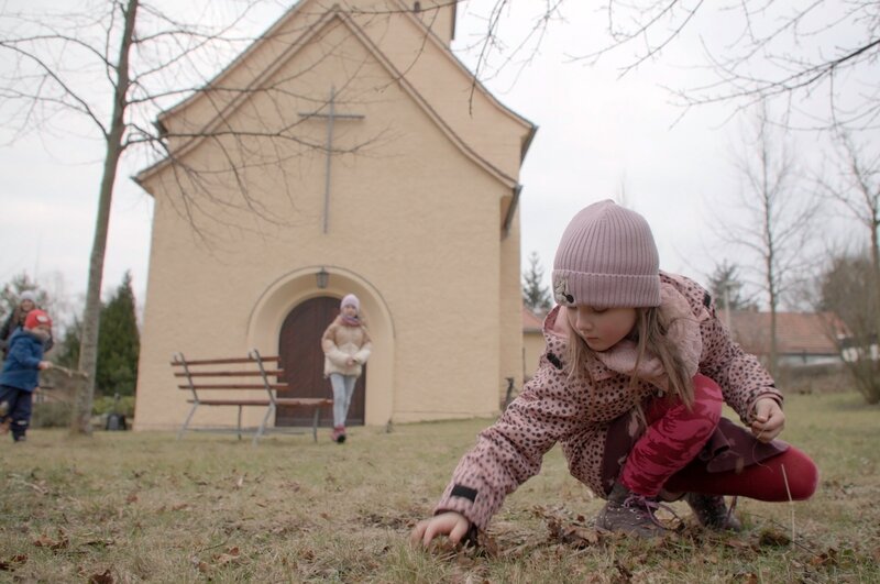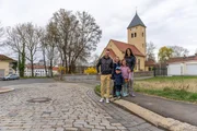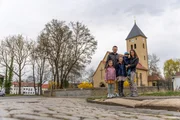 Anne und Marc-Manuel Moritz gehen mit ihren Kindern zur Dorfkirche in Leumnitz, wo die Kinder spielen und Vögel füttern.Bild: © ZDF und Thomas Beckmann (ifage)