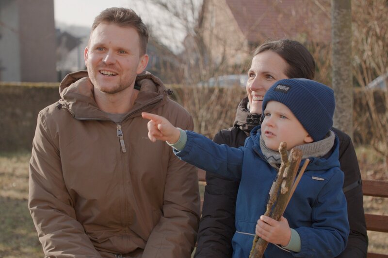 Anne und Marc-Manuel Moritz mit ihrem Sohn Marten auf der Bank im Kirchgarten.Bild: © Thomas Beckmann (ifage) / ZDF