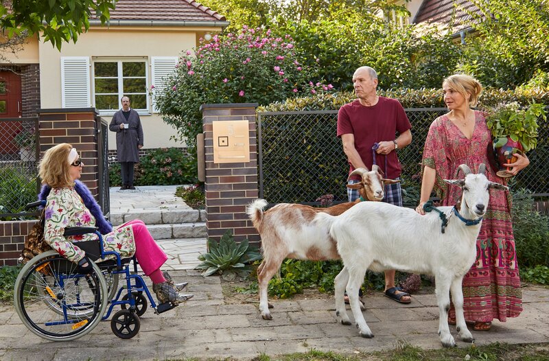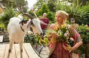 Martin (Götz Schubert, 2. v. re.) und Nina (Tanja Wedhorn, re.) sammeln die Ziegen im Garten von Nachbar Herr Kern (Frank Streffing) ein. Frau Schmitter (Klara Höfels, li.) amüsiert sich.Bild: © ARD Degeto/Michael Handelmann