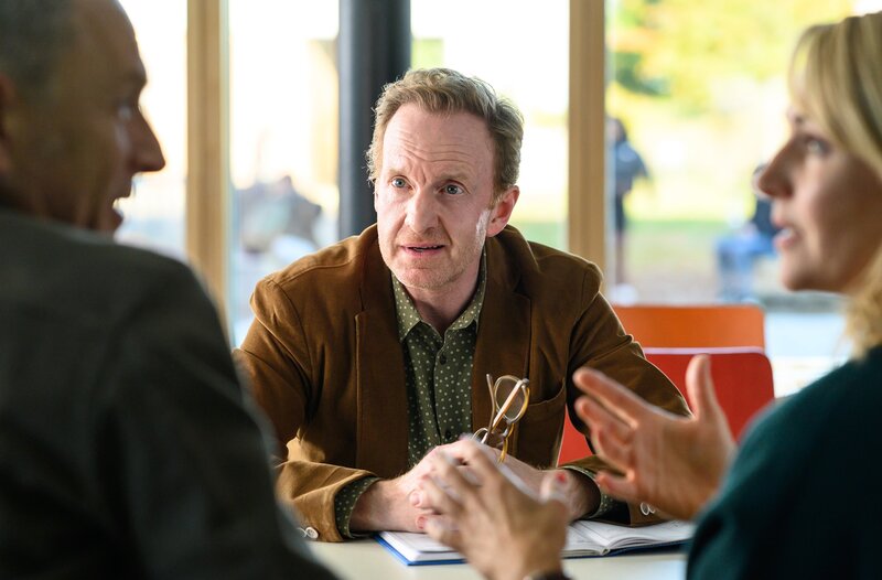 Lehrer Leppin (Mathias Junge, re.) hat schlechte Nachrichten für Martin (Götz Schubert, Mitte) und Nina (Tanja Wedhorn).Bild: © ARD Degeto/Christoph Assmann