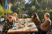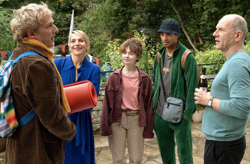 Klimacamp im Garten: Lilly (Ella Lee, Mitte), Nina (Tanja Wedhorn, 2. v. li.) und Martin (Götz Schubert, re.) haben Besuch von Ricky (Jeremias Amoore, 2. v. re.) und Weedie (Kai Lentrodt, li.).Bild: © ARD Degeto/André Kowalski