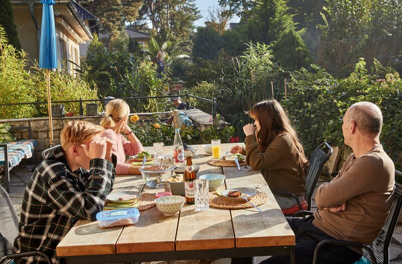 V. li. n. re.:Familie Wilmers für den Klimaschutz: Martin (Götz Schubert), Lilly (Ella Lee) und Nina (Tanja Wedhorn) essen fleischlos, Tom (Finn Cordes) macht nicht mit.Bild: © ARD Degeto/Michael Handelmann