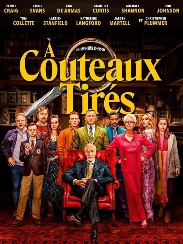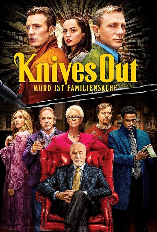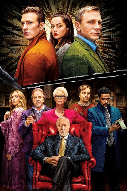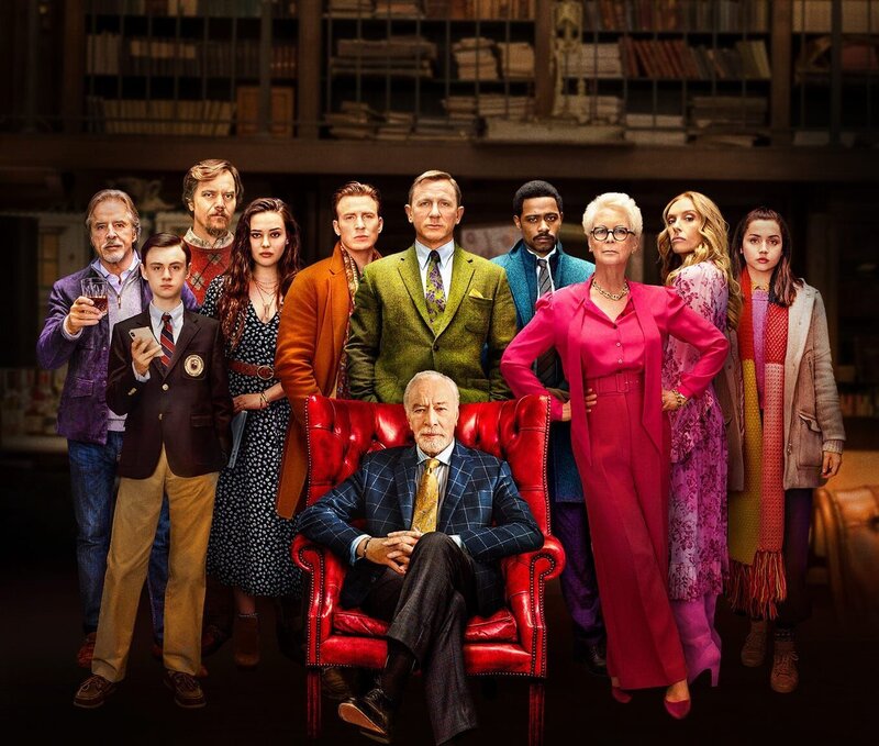 Vorne: Harlan Thrombey (Christopher Plummer). Hinter, l-r: Richard Drysdale (Don Johnson), Jacob Thrombey (Jaeden Martell), Walt Thrombey (Michael Shannon), Meg Thrombey (Katherine Langford), Ransom Drysdale (Chris Evans), Benoit Blanc (Daniel Craig), Lt. Elliott (Lakeith Stanfield), Linda Drysdale (Jamie Lee Curtis), Joni Thrombey (Toni Collette), Marta Cabrera (Ana de Armas).