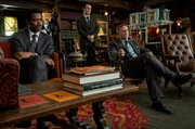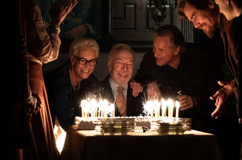 Familiensache: Linda Drysdale (Jamie Lee Curtis, hinten li.), Richard Drysdale (Don Johnson, hinten re.) und Walt Thrombey (Michael Shannon, re.) feiern den Geburtstag von Harlan Thrombey (Christopher Plummer, hinten Mitte).