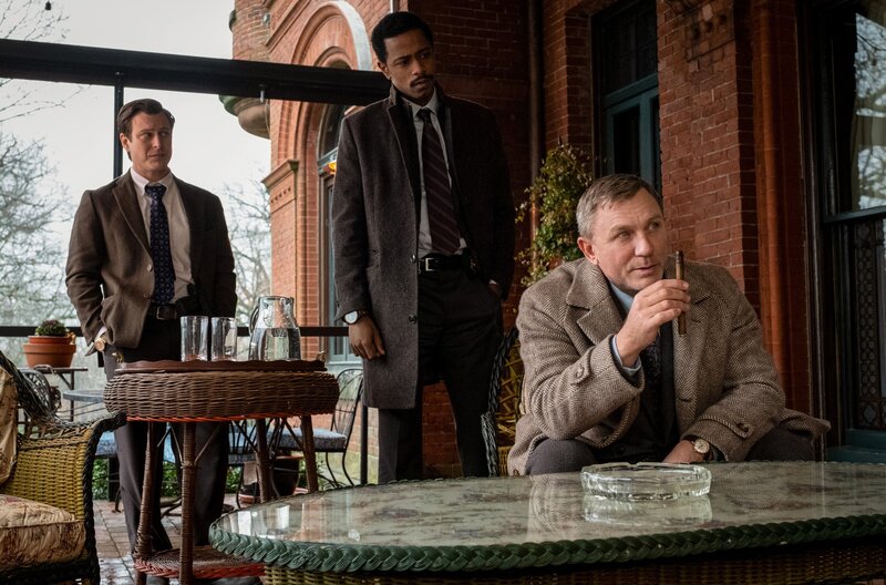 Sie befragen die Familie des Toten: die Polizisten Elliot (Lakeith Stanfield, li.), Wagner (Noah Segan, Mitte) und Privatdetektiv Blanc (Daniel Craig, re.).