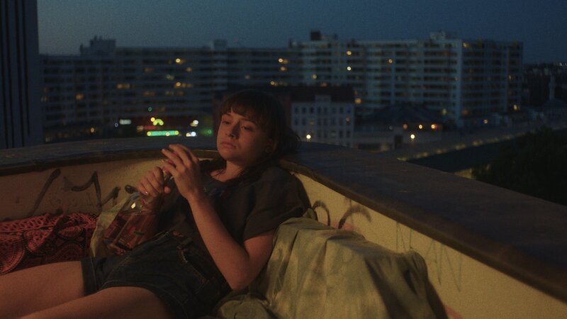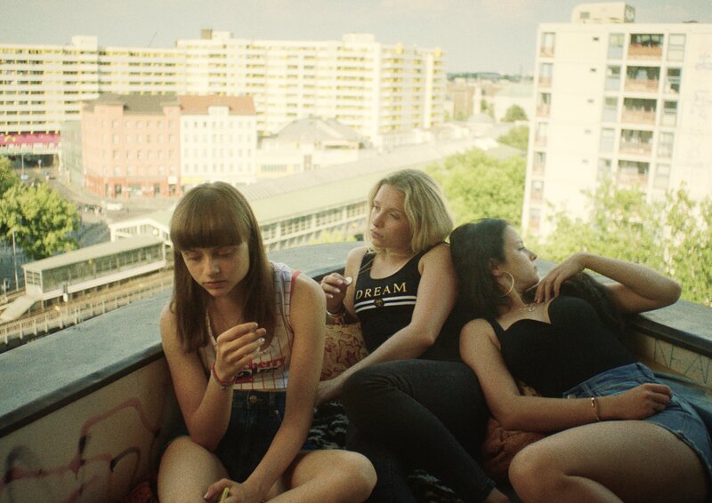 Nora (Lena Urzendowsky, l.), Jule (Lena Klenke, M.) und Aylin (Elina Vildanova, r.) chillen auf dem Balkon ihres Plattenbaus von dem man eine weiten Blick über Berlin hat.Bild: © Martin Neumeyer / ZDF