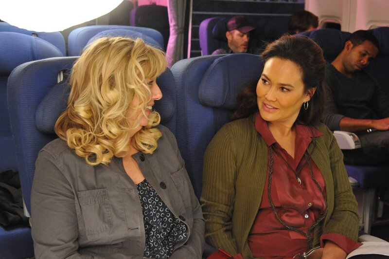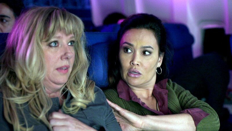 Nachdem das Flugzeug in einen Sonnensturm gekommen ist, versucht Kate (Tia Carrere, re.) ihre Sitznachbarin Krista (Meghan McLeod) zu beruhigen..Nachdem das Flugzeug in einen Sonnensturm gekommen ist, versucht Kate (Tia Carrere, re.) ihre Sitznachbarin Krista (Meghan McLeod) zu beruhigen..Bild: © Tele 5