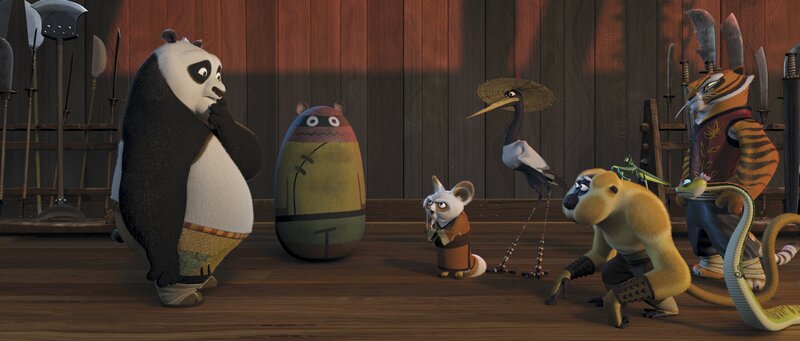 Unerwartet wird er ausgewählt, um eine alte Prophezeiung zu erfüllen. Doch dafür muss der große Panda Po (M.) eine alte Kampfkunst erlernen. Mit von der Partie sind seine Freunde, die "Furiosen Fünf" (v.l.n.r.): Affe, Schlange, Shifu, Tiger.Bild: © Paramount Pictures