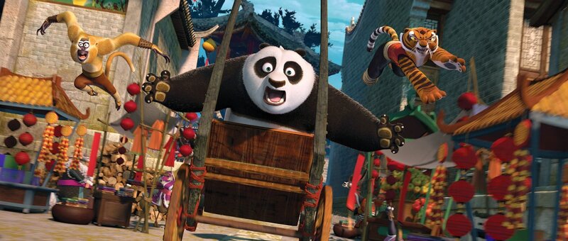 Po (Jack Black, center), Tigress (Angelina Jolie, right) and Monkey (Jackie Chan, left) are back in action chasing a runaway rickshaw in DreamWorks Animation's KUNG FU PANDA 2 to be released by Paramount on May 26, 2011.