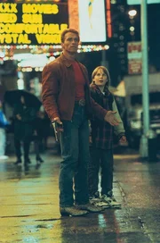 Plötzlich befindet sich Jack Slater (Arnold Schwarzenegger, l.) nicht mehr als Filmfigur in seinem Actionstreifen, sondern wurde gemeinsam mit Danny (Austin O'Brian, r.) ins echte New York gebeamt.
