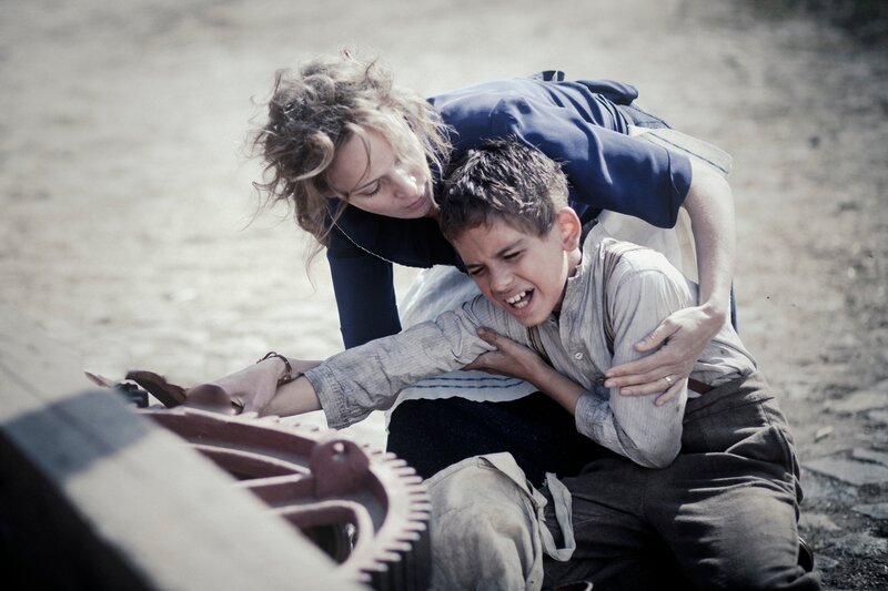 Jurek (Andrzej Tkacz) quetscht sich die Hand in der Dreschmaschine. Frau Herman (Jeanette Hain) eilt ihm zu Hilfe.Bild: © BR, Hagen Keller / ZDF