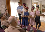 Latife (Neda Rahmanian, stehend 2. v. li.), Ehemann Burhan (Murathan Muslu, stehend li.) und ihre Töchter Lale (Elyna Donchev, stehend r.), Peyda (Anna Shirin Habedank, stehend 2. v. re.) und Nihal (Ronja Russow, stehend 3. v. re.) bewirten Gäste bei einem Informationsabend für Migranten in ihrem Haus.Bild: © ARD Degeto/Julia von Vietinghoff