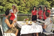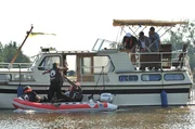Zum Angriff! Werner (Michael Gaedt, stehend im Schlauchboot) holt zum entscheidenden Schlag gegen Henner (Stephan Szász, auf dem Hausboot links), Finke (Golo Euler, rechts) und vor allem Simon (Gabriel Merz, auf dem Hausboot Mitte) aus.