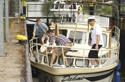 Gerade noch rechtzeitig greift Simon (Gabriel Merz) ein, als Finke (Golo Euler) und Henner (Stephan Szász) dabei sind, das Boot an die Schleusenwand zu steuern.