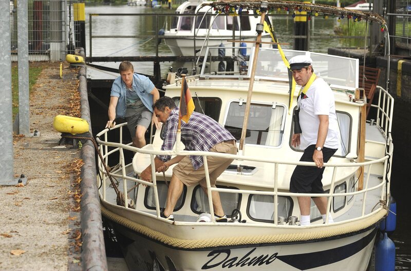 Drei krisengeplagte Stuttgarter schippern mit einem Hausboot eine Woche lang auf der Havel Richtung Müritz. Die ungewohnte Dreisamkeit bringt so manches zum Vorschein, was bisher erfolgreich verschwiegen und verdrängt wurde. Die sommerliche Bootsfahrt bahnt den Weg zu der Erkenntnis, dass eine Wende im Leben keineswegs schaden könnte. Finke (Golo Euler) braucht zwei neue Leichtmatrosen als Lückenbüßer. Weil seine Freundin Cora (Susanne Bormann) doch nicht mit auf die geplante Bootstour geht, schlägt Finke seinen Badmintonkumpels Henner (Stephan Szász) und Simon (Gabriel Merz) eine gemeinsame Reise vor. Die drei Sportsfreunde kennen einander kaum - aber so ein Hausboot bietet viele Möglichkeiten, sich anzunähern. Für eine Woche gehen die drei Stuttgarter mit dem Hausboot auf große Fahrt Richtung Müritz. Einen Bootsführerschein hat zwar keiner von ihnen, aber dafür haben sie alle einen Haufen Sorgen, wenn auch höchst unterschiedlicher Natur. Finkes Freundin Cora ist schwanger. Aber Vater werden? Dazu fühlt er sich mit Mitte 30 nicht bereit. Henner ist Pastor, glaubt aber schon lange nicht mehr an Gott. Und Simon, der chaotische Handwerker, hat einen Berg Schulden und einen Auftraggeber, der ihm Rache geschworen hat. So steuern die drei Männer in eine Woche voller Abenteuer und Katastrophen. Eine Woche, in der noch nicht mal ein "Rundumsorglospaket ohne Selbstbeteiligung" verhindern kann, dass sich ihr Leben für immer verändern wird. "Leichtmatrosen - Drei Mann in einem Boot" ist ein schwungvolles Roadmovie auf dem Wasser, für das Regisseur Stefan Hering seine drei Protagonisten mit leichter Hand durch die Widrigkeiten der Schifffahrt und der Selbsterkenntnis steuert. Silja Clemens schrieb das Drehbuch dazu nach der Romanvorlage "Leichtmatrosen" von Tom Liehr. Golo Euler, Stephan Szász und Gabriel Merz spielen die drei Hausbootfahrer, in weiteren Rollen sind Susanne Bormann, Michael Gaedt, Luca Zamperoni und Ramona Kunze-Libnow zu sehen. Finke: Golo Euler Henner: Stephan Szász Simon: Gabriel Merz Cora: Susanne Bormann Werner: Michael Gaedt Anna: Xenia Assenza Frau Gollasch: Ramona Kunze-Libnow Dominik: Luca Zamperoni Finn-Lukas: Konstantin Brackelmann Lilly-Marie: Amelie Klein Horst: Hans Klima Nicole: Tina Haseney Torsten: Martin Thaler und andere...