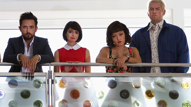 Auf einer Konferenz verschwören sich Emma, ihre Verehrer Diego und Sam, sowie Emmas Kollegin Nina gegen Emmas Ex-Freund Luke, der mit einer von ihr geklauten Idee berühmt geworden ist. Von links: Diego (Justin Chatwin), Emma (Kate Micucci), Nina (Hana Mae Lee) und Sam (Steve Howey).