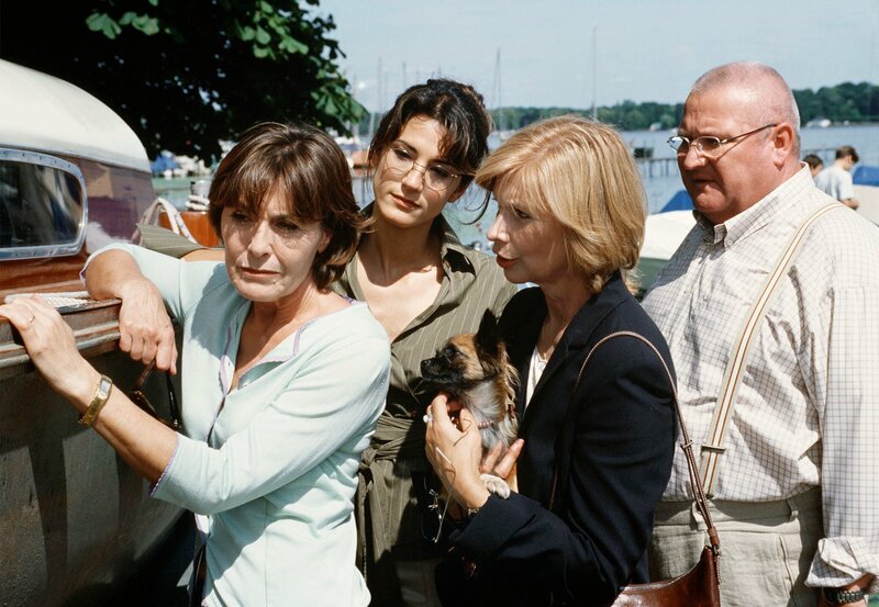 Tochter Karoline (Mariella Ahrens, 2.v.li.) sowie Karl Mooskramer (Horst Krause) und auch seine Frau Sylvia (Ursela Monn, 2.v.re) wollen Juliane (Thekla Carola Wied) dazu überreden, ihr Segelboot zu verkaufen.