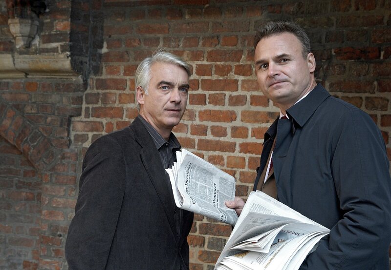 Die Presse belagert Bauamtsleiter Otto Schlegel (Christoph M. Ohrt, li.) und seinen Mitarbeiter Brenner (Oliver Mommsen, 2.v.li.).Bild: © ARD Degeto/Sandra Hoever