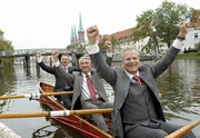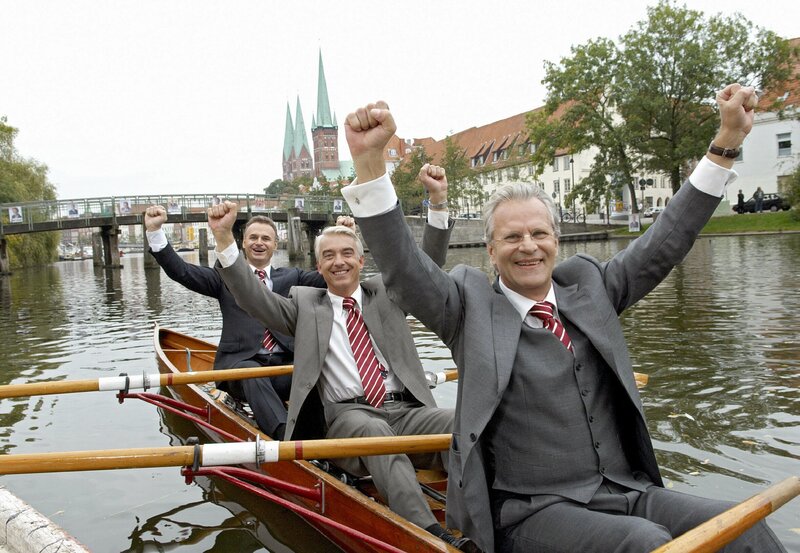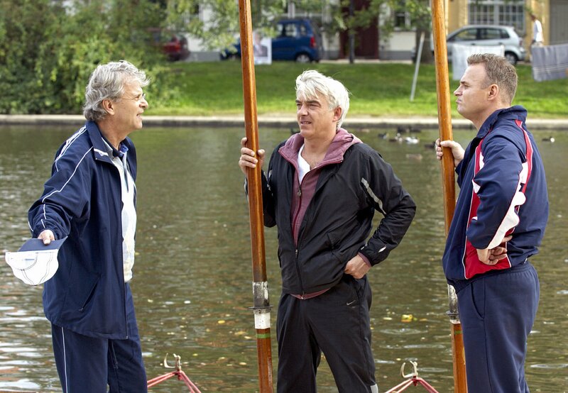 Drei Mann in einem Boot: Bürgermeister Schneider (Peter Sattmann, vorne), Bauamtsleiter Otto Schlegel (Christoph M. Ohrt, Mitte) und Pressesprecher Droller (Oliver Breite).; ARD Degeto LIEBE IM HALTEVERBOT, am Samstag (09.11.24) um 14:00 Uhr im ERSTEN. Drei Mann in einem Boot: Bürgermeister Schneider (Peter Sattmann, vorne), Bauamtsleiter Otto Schlegel (Christoph M. Ohrt, Mitte) und Pressesprecher Droller (Oliver Breite). © ARD Degeto/Sandra Hoever, honorarfrei - Verwendung gemäß der AGB im engen inhaltlichen, redaktionellen Zusammenhang mit genannter Degeto-Sendung und bei Nennung "Bild: ARD Degeto/Sandra Hoever" (S2). ARD Degeto/Programmplanung und Presse, Tel: 069/1509-335, degeto-presse@degeto.deBild: © ARD Degeto/Sandra Hoever