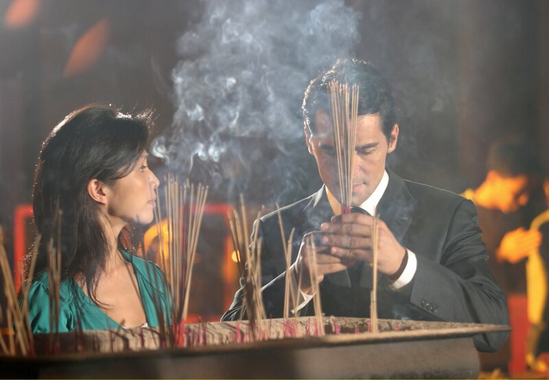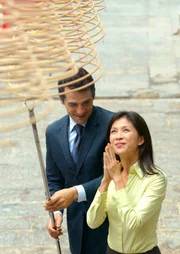 In einem Gebetstempel finden Alexander (Erol Sander) und Lilin (Li Lin Wong) Entspannung vom Trubel der Megacity Singapur.Bild: © ARD Degeto/Terry Chua