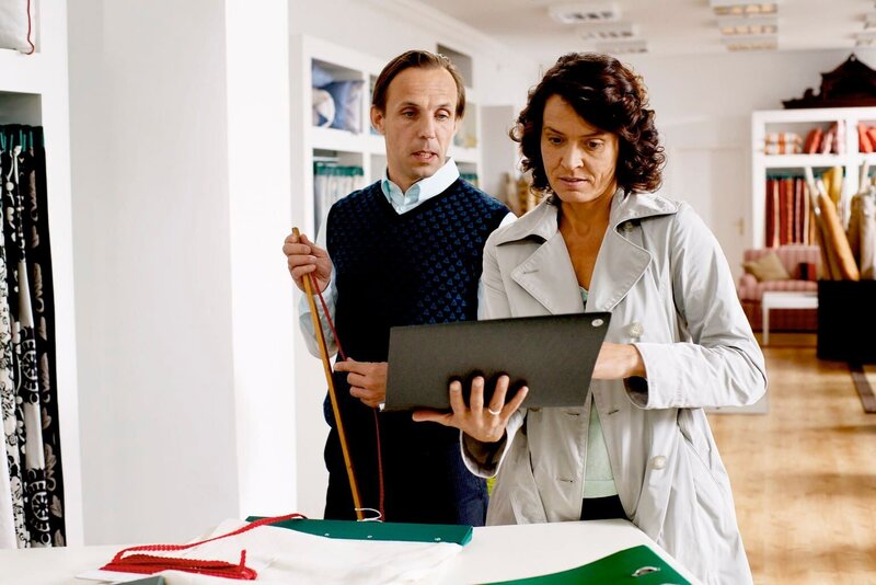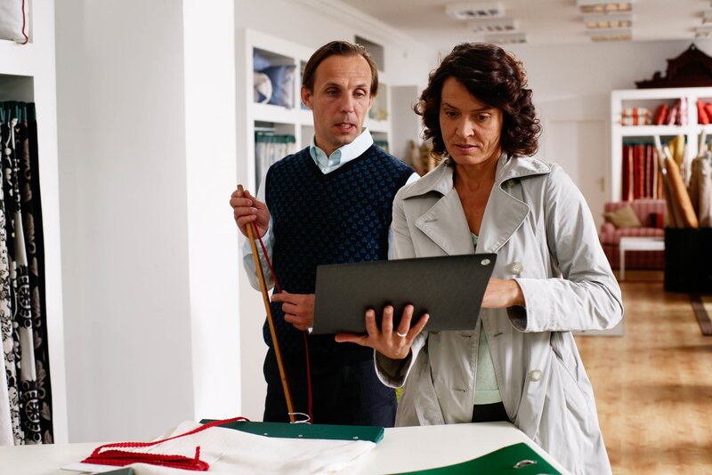 Zunächst ist Herr Wolter (Gotthard Lange, l.) nicht bereit, der studierten Innenarchitektin Silke Hauswald (Ulrike Folkerts, r.) einen einfachen Job als Verkäuferin anzubieten. Doch dann greift Silkes Patenkind zu einem Trick ...Bild: © Sat.1