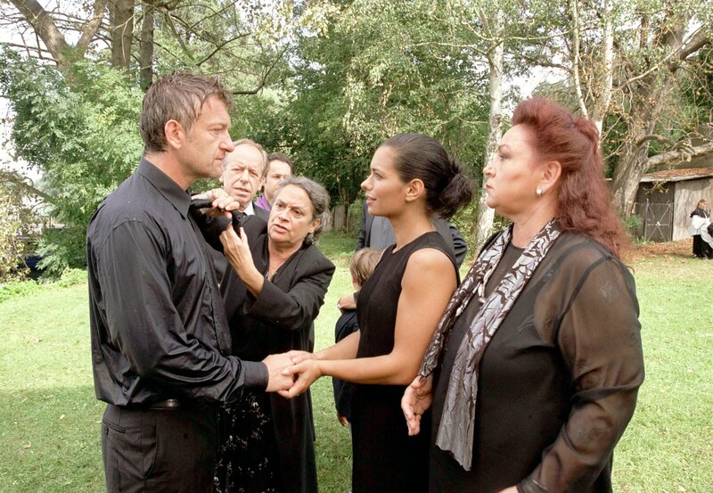 Bei der Beerdigung seines Vaters trifft Dr. Peter Haller (Dominic Raacke, li.) zum ersten Mal auf Stella Gandolfi (Sandra Speichert, 2.v.re.) - seine große Liebe, auch wenn er es noch nicht weiss. Rechts Antonia (Roswitha Dost).Bild: © SWR/Degeto/Katrin Knoke