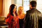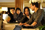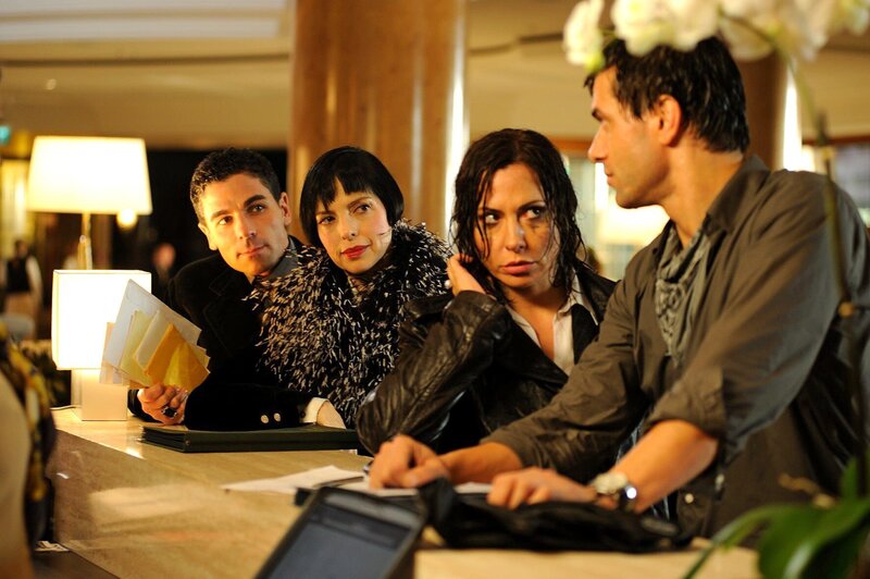 Verena (Simone Thomalla, 2.v.r.) kommt mit Leon (Kai Schumann, r.) in ihrem Hotel an und trifft auf Estella Da Silva (Helen Schneider, 2.v.l.) mit ihrem Kollegen Juan (Roberto Guerra, l.)