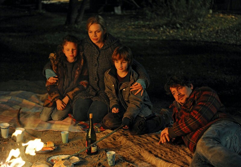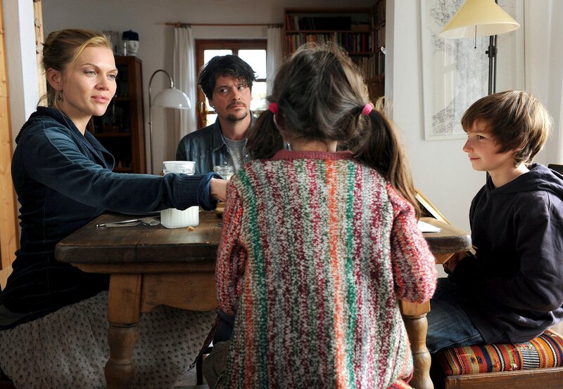 Bei Teresa (Anna Loos, links) und ihren beiden Kindern Max (Felix Steitz) und Lisa (Mercedes Jadea Diaz) fühlt Robert (Fritz Karl) sich auf merkwürdige Art geborgen.Bild: © ARD Degeto/Kerstin Stelter
