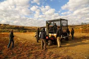 Vorbereitung der Dreharbeiten: Aufbau des Sicherheitsgitters für die Filmcrew auf dem Pick-Up-Wagen.Bild: © BR/ORF/Rilk Film/Andreas Laschober