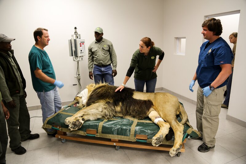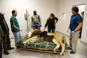 Der riesige Löwe 'Kongo' in Narkose bei einer Röntgenuntersuchung im Veterinärzentrum von Lionsrock. - Tierarzt Gerhard Steenkamp (2.v.l.) und Chef-Tierpflegerin Hildegard Pirker (Bildmitte).Bild: © 3sat