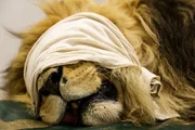 Der mächtige Löwe 'Kongo' in Vollnarkose vor einer Zahn-OP. Die Augen sind dabei geöffnet, daher wird als Lichtschutz für die Augen ein Tuch über den Löwenkopf gebreitet.Bild: © 3sat